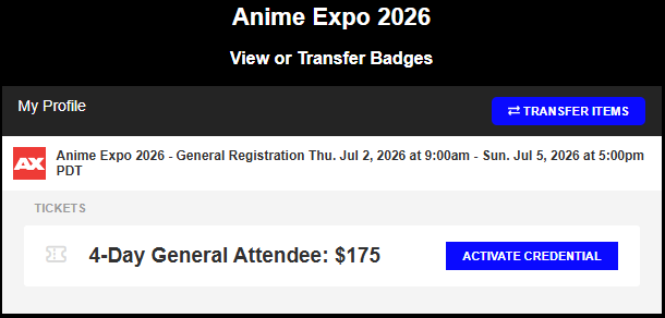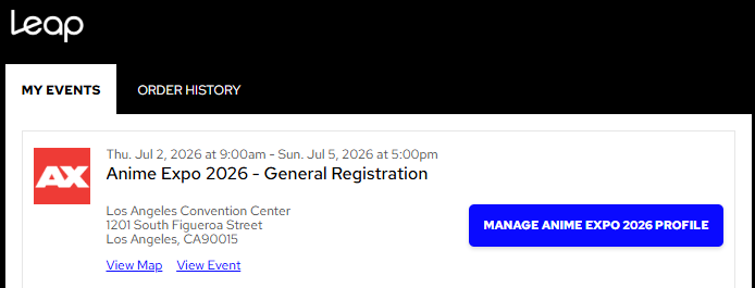 2. Login to your Leap (formerly ShowClix) MyTickets account. Click Manage My Anime Expo 2026 Profile.