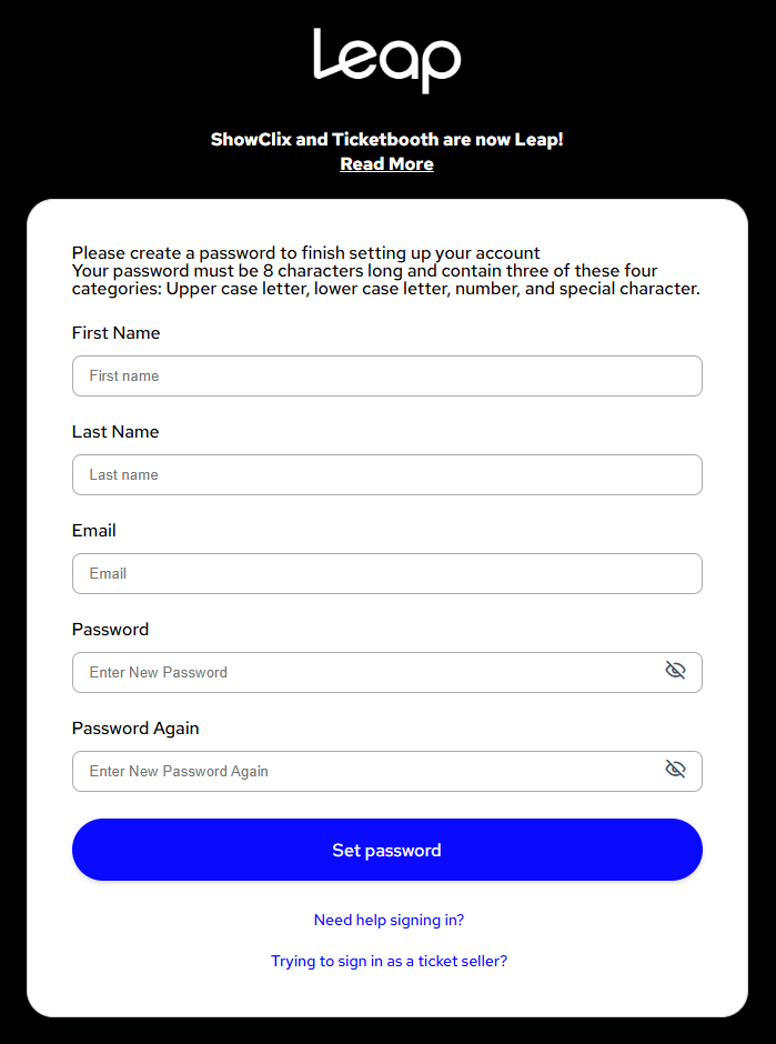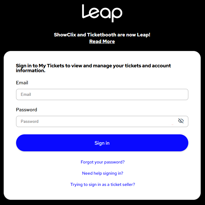 If you need assistance logging in, then please contact Leap Support by clicking on the "Need help signing in?" link at the bottom of the login screen or go to the Leap (formerly ShowClix) Event Help Center page to submit your support ticket.